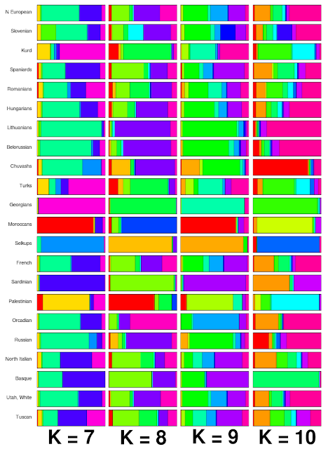 I insist in this being a mere effect of the sampling strategy: more West Asian samples would have caused this specificity to show up earlier in the runs (K=4) but, maybe more importantly, the European difference would have been the one eclipsed by the West Asian component. I actually have one example from yesterday's exercise: